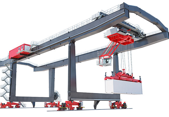 Mecanismul goliat cu containere montate pe șine (macara RMG) este folosit în principal pentru încărcarea, descărcarea, deplasarea și stivuirea containerelor în câmpurile de transbordare a căilor ferate și a unor șantiere mari de depozitare a containerelor. Se compune din grinzi principale, rigle și flexibile, cărucioare, mecanism de ridicare, mecanism de acționare a macaralei, sistem electric și cabină de acționare.